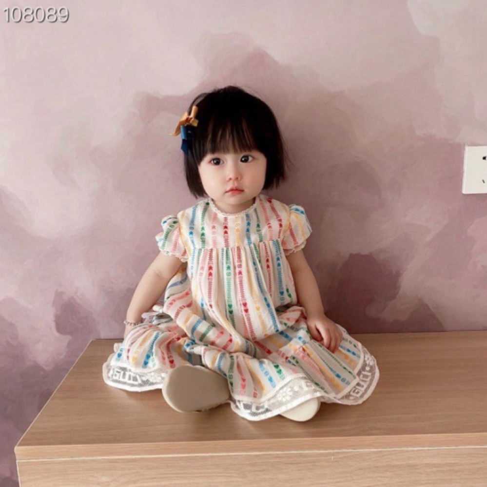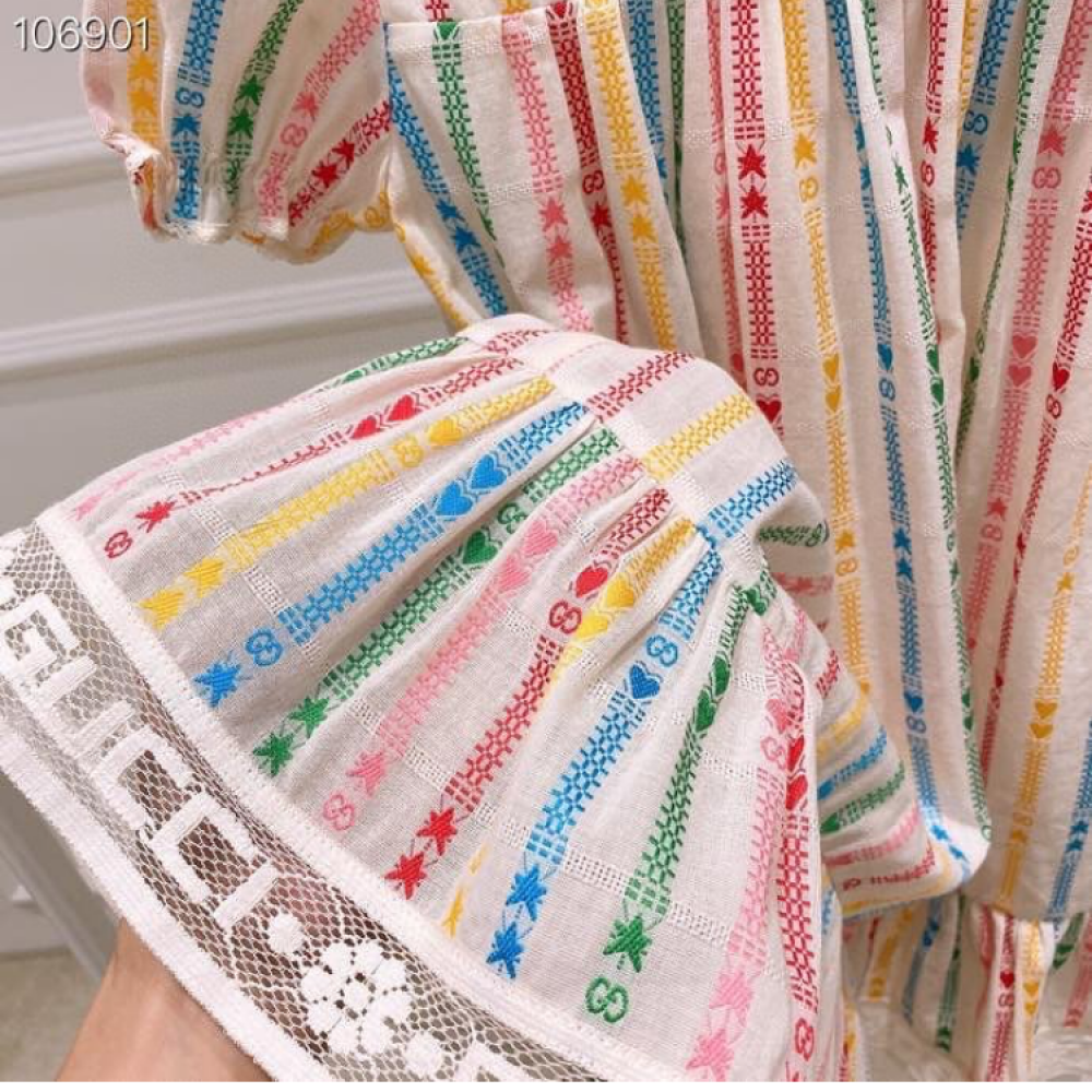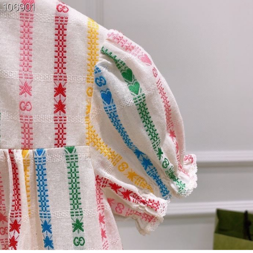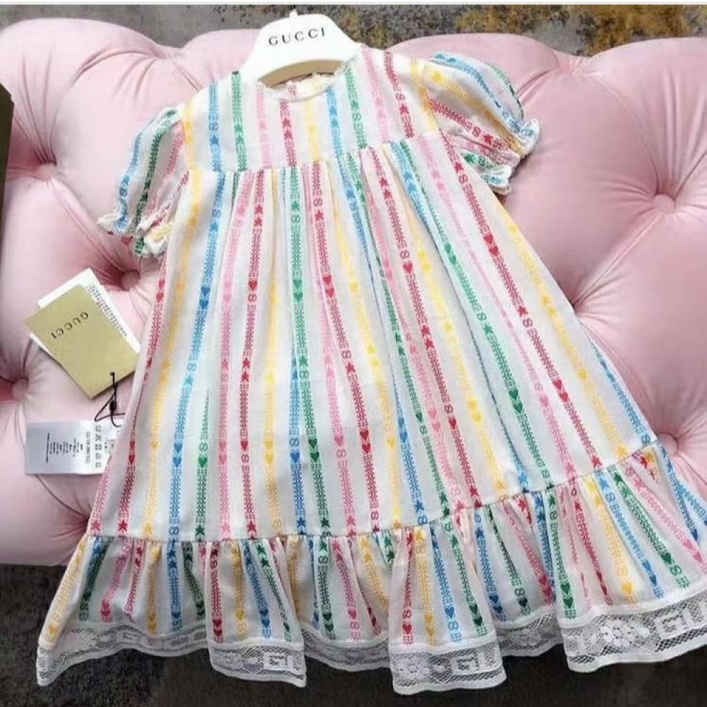 فستان بناتي من علامة غوتشي، بتصميم ملون ومرح. يتميز الفستان بخطوط عمودية متعددة الألوان، مع تفاصيل صغيرة لشعار غوتشي ونجمة. الأكمام قصيرة ومنتفخة قليلاً، وتنتهي الحافة السفلية بكشكشة مزدوجة من الدانتيل الأبيض.